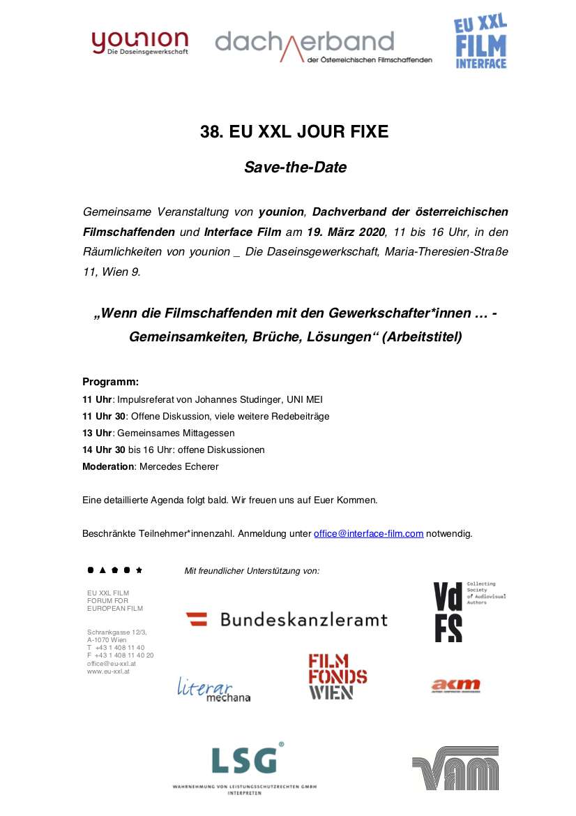 38. EU XXL JOUR FIXE Save-the-Date Gemeinsame Veranstaltung von younion, Dachverband der österreichischen Filmschaffenden und Interface Film am 19. März 2020, 11 bis 16 Uhr, in den Räumlichkeiten von younion _ Die Daseinsgewerkschaft, Maria-Theresien-Straße 11, Wien 9. „Wenn die Filmschaffenden mit den Gewerkschafter*innen ... - Gemeinsamkeiten, Brüche, Lösungen“ (Arbeitstitel) Programm: 11 Uhr: Impulsreferat von Johannes [...]